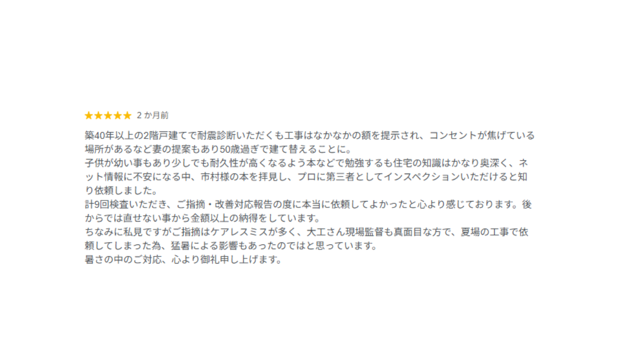 新築現場のインスペクションは毎月20件以上のお問合せを頂いています。もちろん、リフォームトラブルや欠陥住宅の相談、中古住宅診断も可能です。幅広い業務に対応可能なのは、経験値のなせる業です。