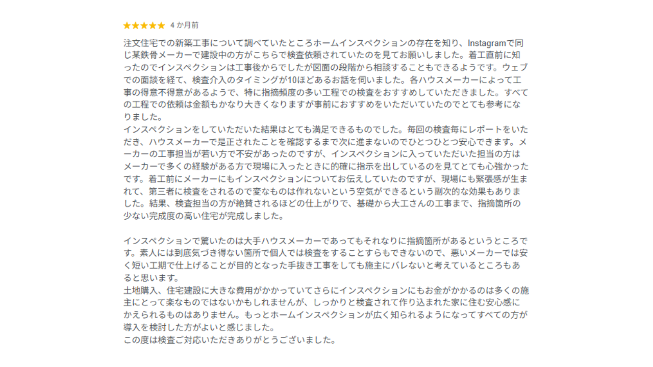 業務開始時より大手ハウスメーカーのインスペクションを実施してきた我々だから、各ハウスメーカーの長所と短所を知り尽くしています。現場での指摘事項は、修補方法も含めて是正指導を実施しています。