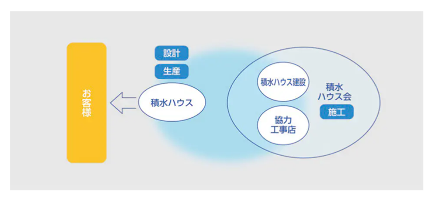 積水ハウスを例に出すと、直接責任施工体制の確立を謳っており、積水ハウスが100%出資するグループ会社の「積水ハウス建設」や「指定工事店(協力工事店)」を中心とした組織による施工体制としています。