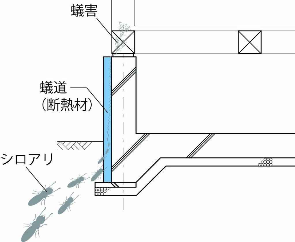 基礎の外側に断熱材を施工する際、最も注意しなければならないのがシロアリ被害です。シロアリのうち、ヤマトシロアリやイエシロアリは地面から上がってきますが、断熱材が直接土と接することになるため、断熱材を食い破って建物へ進入してきます。さらに厄介なのが、断熱材の中を蟻道とするため、発見が遅れることが多いのです。