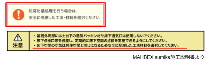 要するに、薬剤メーカー、換気機器メーカーとしては使うなら換気が十分必要であり、かつ空気質を汚染する可能性のある揮発性のある薬剤を室内空間で使用はNGということです。基礎断熱工法の場合は床下空間=室内の扱いなので、有機農薬系の防腐防蟻材は基本的に採用は難しいということですね。