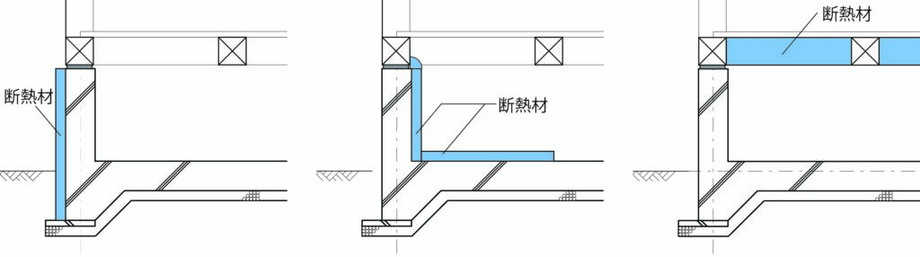 基礎外側断熱=床下室内扱い 基礎内側断熱=床下室内扱い 床断熱=床下屋外扱い