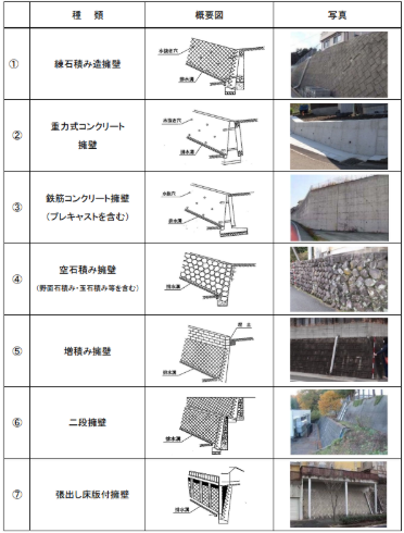 ①には間地ブロック積み擁壁や型枠擁壁(CP型枠など)、大谷石積み擁壁などが該当します。④~⑦は宅地造成等規制法等の技術的基準に適合しない、いわゆる不適格擁壁と呼ばれるものですので、気になる敷地にこれら擁壁がある場合には注意が必要です。