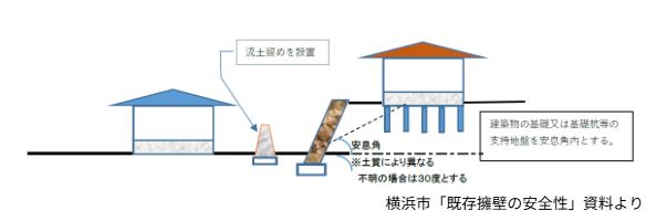 土留めを別途作る、擁壁下部から安息角(角度は土質等により異なる)より基礎や基礎くいを深くするなどして、擁壁が壊れても建物に影響が無いようにします。