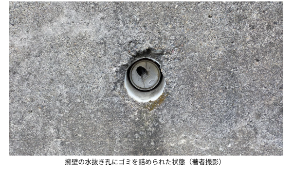 水抜き孔から適切に排水されていないということは、敷地内に降った雨水等が溜まったままで擁壁に負担がかかっている可能性があります。写真のようにゴミを詰められている場合もよく見かけますね。