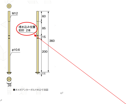 上記参考画像のように、アンカーボルトには必要埋め込み位置に刻印がされています。