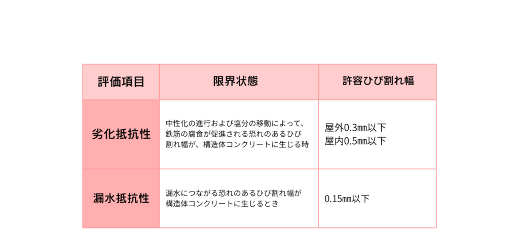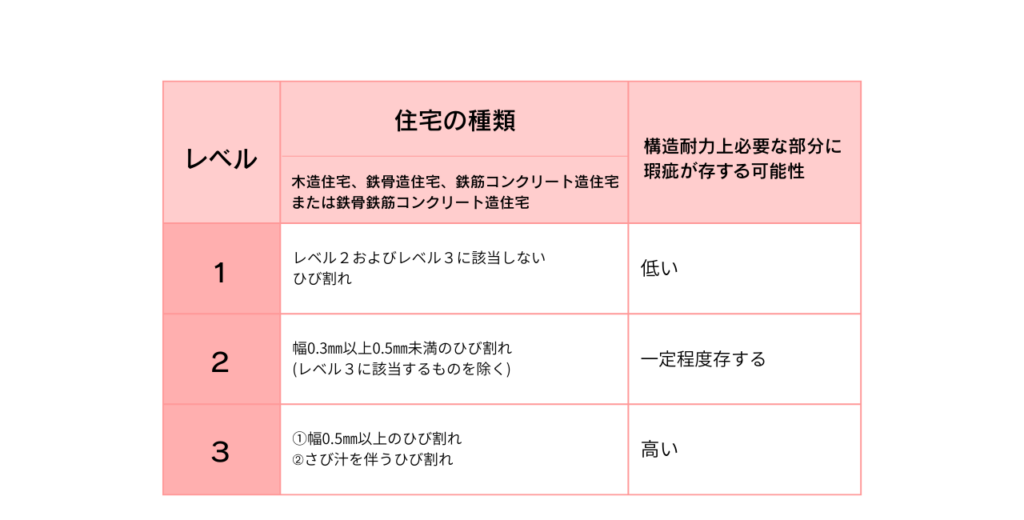 コンクリートのクラック(ひび割れ)の基準に関しては下記の図を参照ください。