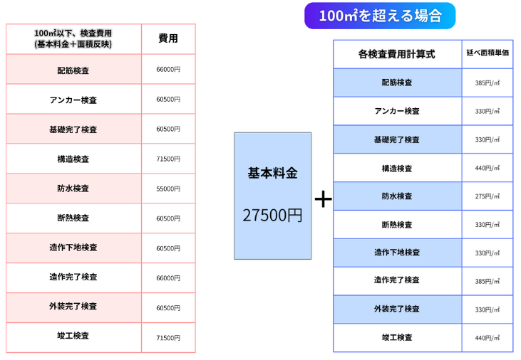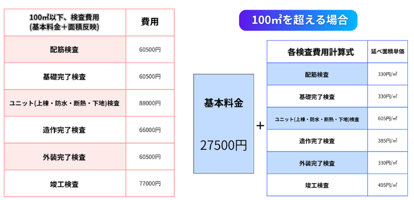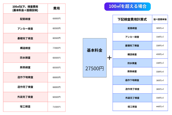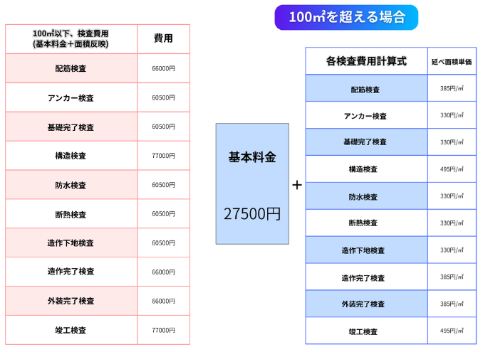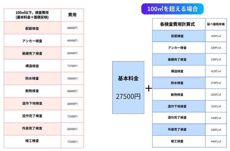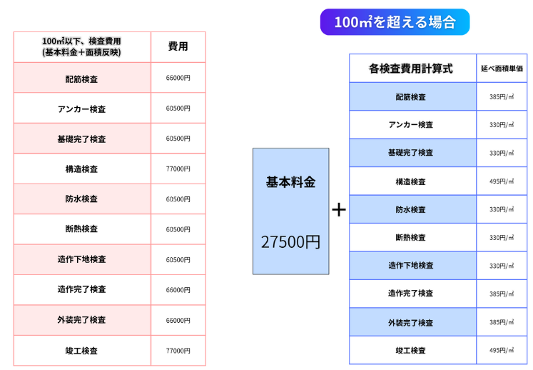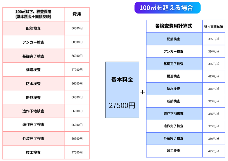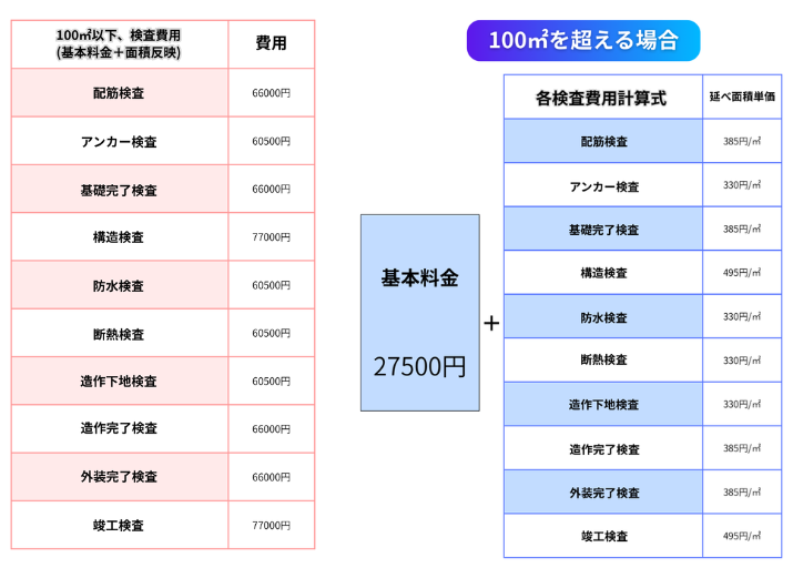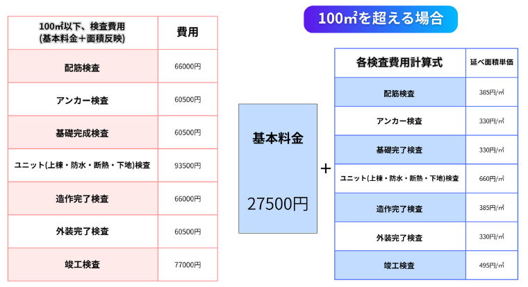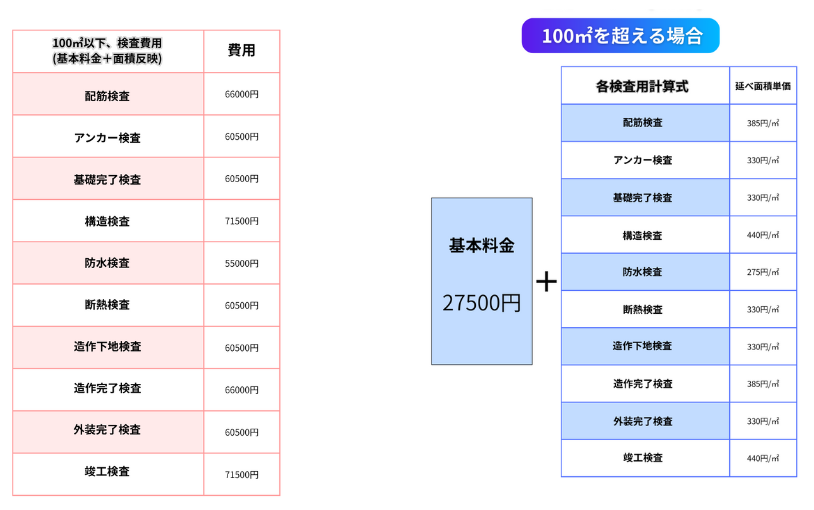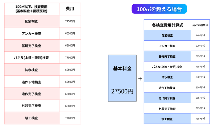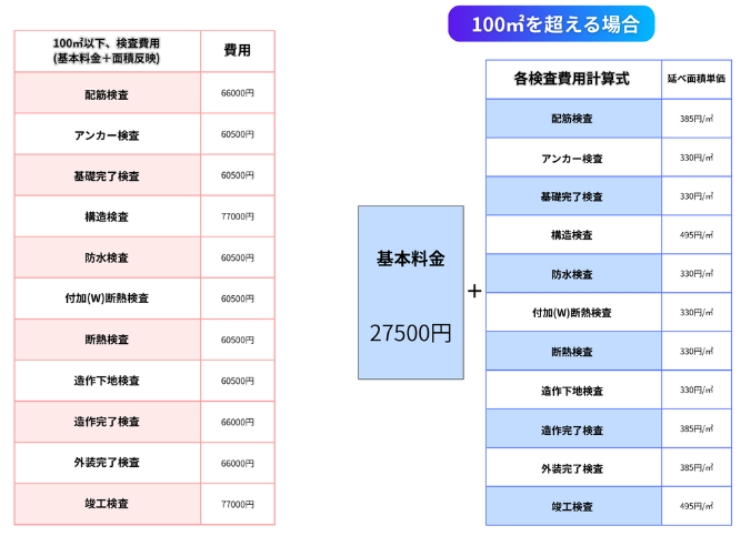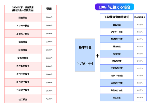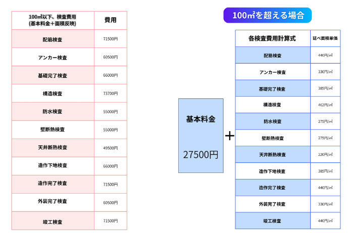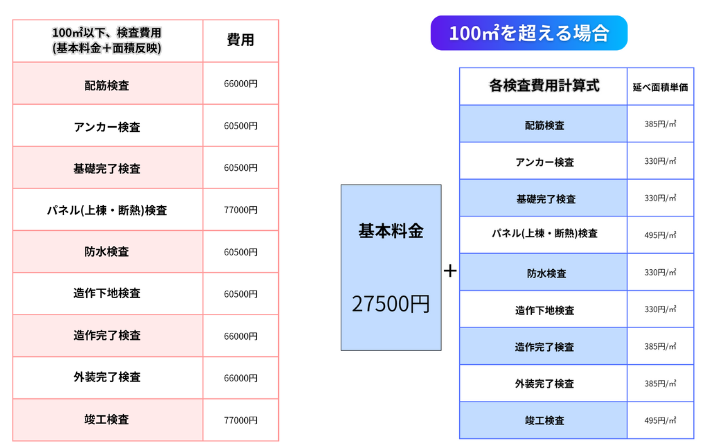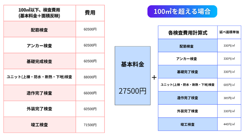 各メーカーの検査費用に関しては、工法・部材特徴・作業マニュアル・過去検査の実績(指摘の多い、少ないなど)を基に決めております。金額はすべて消費税(10%)込みの表記となります。